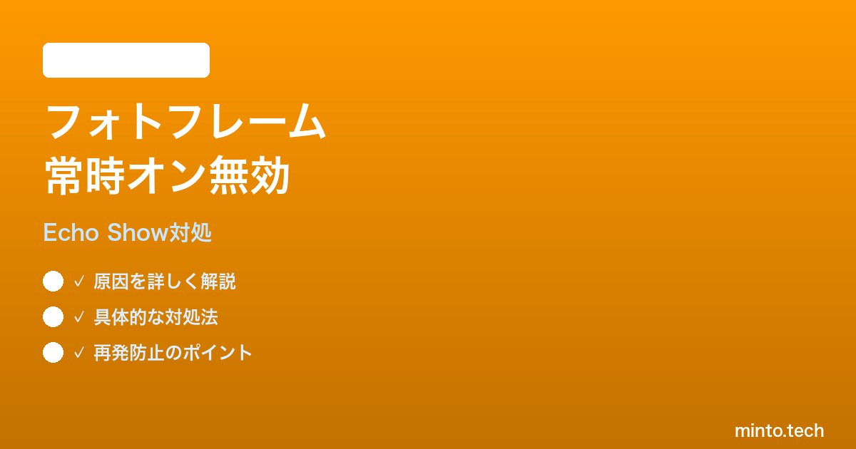 常時オンが効かない原因として頻度が高いのは、第一に「写真フレーム」の表示時間設定が短い、第二にAlexaアプリのデバイス詳細でホームコンテンツのローテーションが優先されている、第三にナイトモードがオンで暗くなっている、第四にエコモードや省電力設定がオンになっている、第五にファームウェアが古い、です。