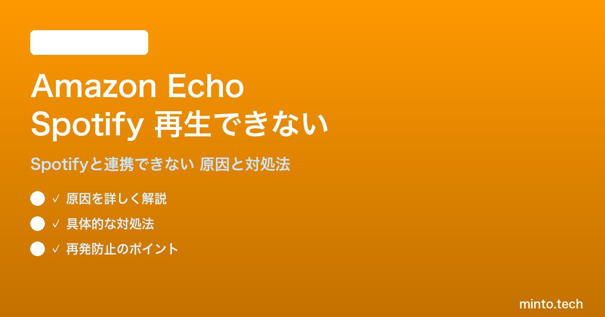 主な原因は以下の3つです。①AlexaアプリでSpotifyスキルの連携が切れている ②EchoデバイスのWi-Fi接続が不安定 ③Spotifyのサーバー障害。まずAlexaアプリでSpotifyスキルを再連携し、次にWi-Fi接続を確認してください。