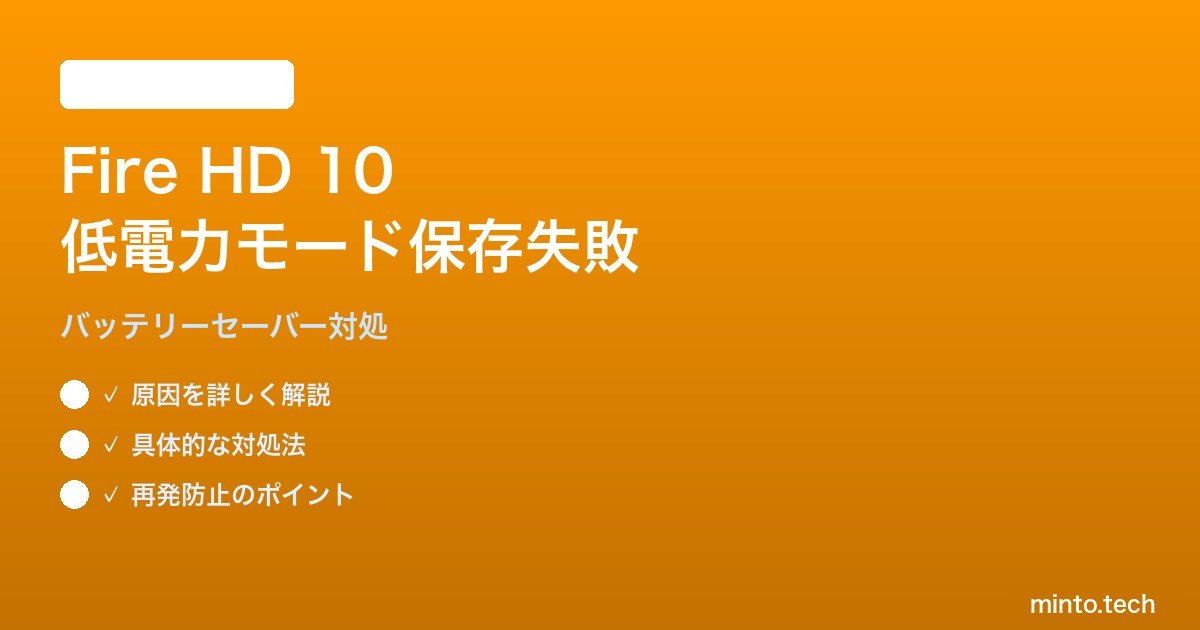 Amazon Fire HD 10(2024年モデル)の低電力モード(バッテリーセーバー)を有効化しても、再起動するたびに勝手にオフに戻ってしまう、しきい値を変更しても保存されない、といったトラブルに困っていませんか。電車移動中や旅行先でバッテリーを長持ちさせたいから低電力モードを使っているのに、知らないうちに無効化されていてバッテリーが急減した、という経験は多くのユーザーから報告されています。実はFire HD 10(2024)で採用されたFire OS 8.x.xでは、低電力モードの設定が一部のシステムイベント(再起動、強制終了、バッテリー低下からの充電完了など)でリセットされる仕様変更が入っており、加えてサードパーティの省電力アプリとの相性問題、自動有効化ロジックの判定ズレなど、複数の要因が複雑に絡み合っています。本記事では、Fire HD 10(2024)で低電力モード設定が保存されないトラブルを、初心者の方でも自力で解決できるよう、Fire OS設定の正しい操作手順から、再起動時のリセット回避策、サードパーティアプリの干渉特定方法まで、徹底的に解説します。