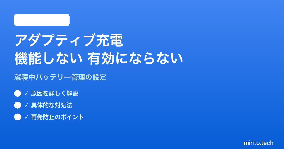 アダプティブ充電はバッテリーの長寿命化に効果的な機能ですが、正しく動作するためにはいくつかの条件を満たす必要があります。設定をオンにするだけでは機能しないケースも多いのです。