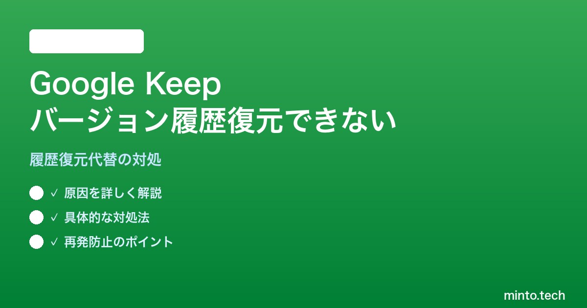 Google Keepはシンプルさが魅力のメモアプリですが、シンプルゆえに「過去のバージョン履歴がない」という落とし穴があります。重要な内容を上書きしてしまった、間違って削除した、古い情報に戻したい——そんな時に「バージョン履歴から復元」と検索しても、Google Docsのような履歴機能が存在しないことに気づき愕然とする方が大勢います。