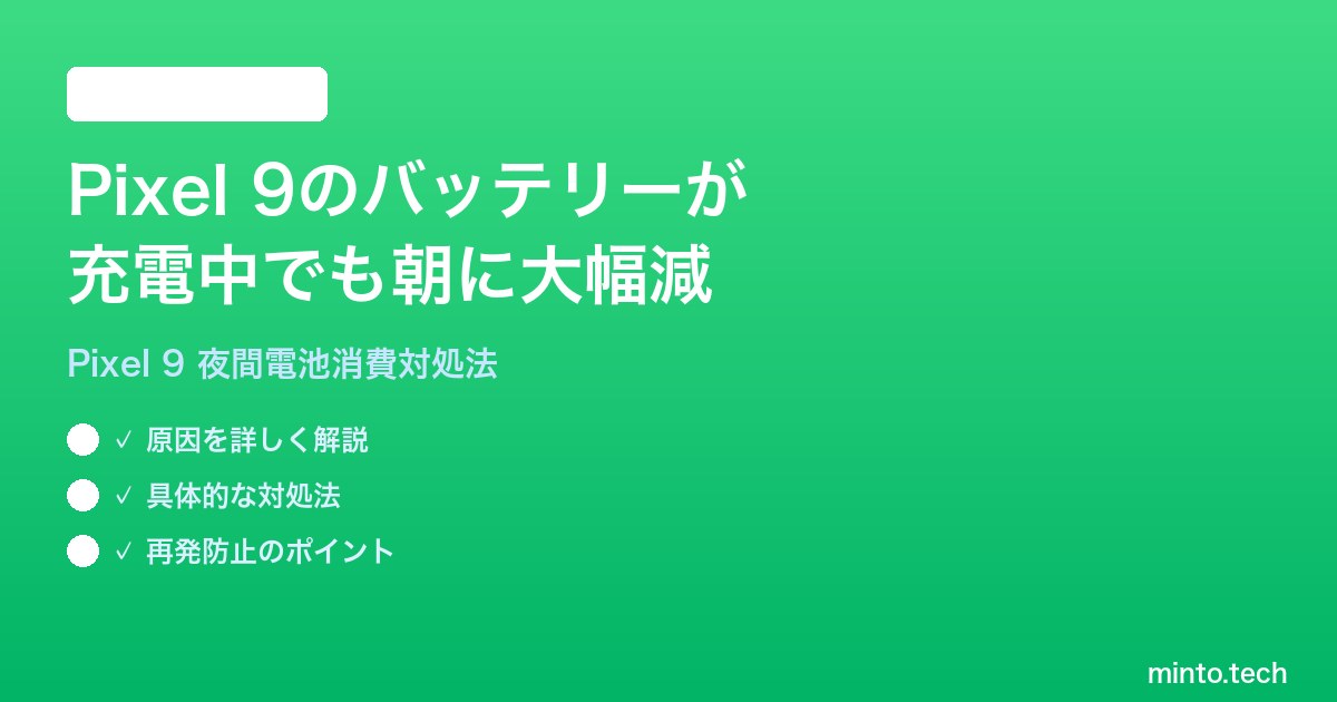 Google Pixel 9で就寝中にバッテリーが大幅に減る問題は、大きく分けて「充電器の出力不足」「バックグラウンドアプリの過剰動作」「Googleサービスの夜間同期」「アダプティブバッテリー設定の問題」の4つが主な原因です。