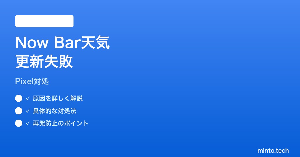 PixelのNow Barで天気が更新されない問題は、ほとんどが位置情報権限「常に許可」になっていないことが原因です。次にPixel Launcher・Pixel Weatherアプリのバージョンとキャッシュをチェックしてください。これら3点で9割のケースが解決します。残るケースはGoogleアカウントの再ログイン、バッテリーセーバー除外で対処できます。