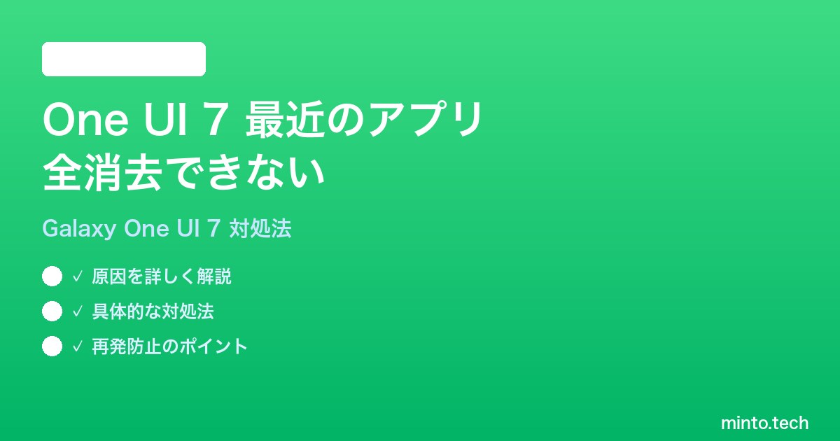 Samsung GalaxyのOne UI 7で「最近使ったアプリ(履歴)」を全て消去しようとしても、一部のアプリが残ってしまう、または「全て閉じる」ボタンが機能しない、という問題に悩んでいませんか?アプリ履歴が消えないのはバッテリー消費が気になる方やプライバシーを守りたい方には特に困りますよね。