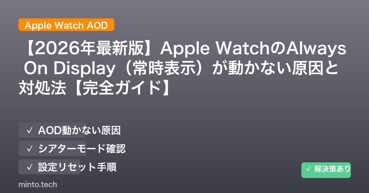Apple WatchのAlways On Display(常時表示・AOD)は、手首を上げなくても時刻や通知をさっと確認できる便利な機能です。しかし「AODを設定しているのに画面が真っ暗になる」「常時表示が突然オフになった」といった問題が多く報告されています。この記事では、Apple WatchのAODが動かない原因を徹底解説し、確実に直せる対処法をステップごとに紹介します。