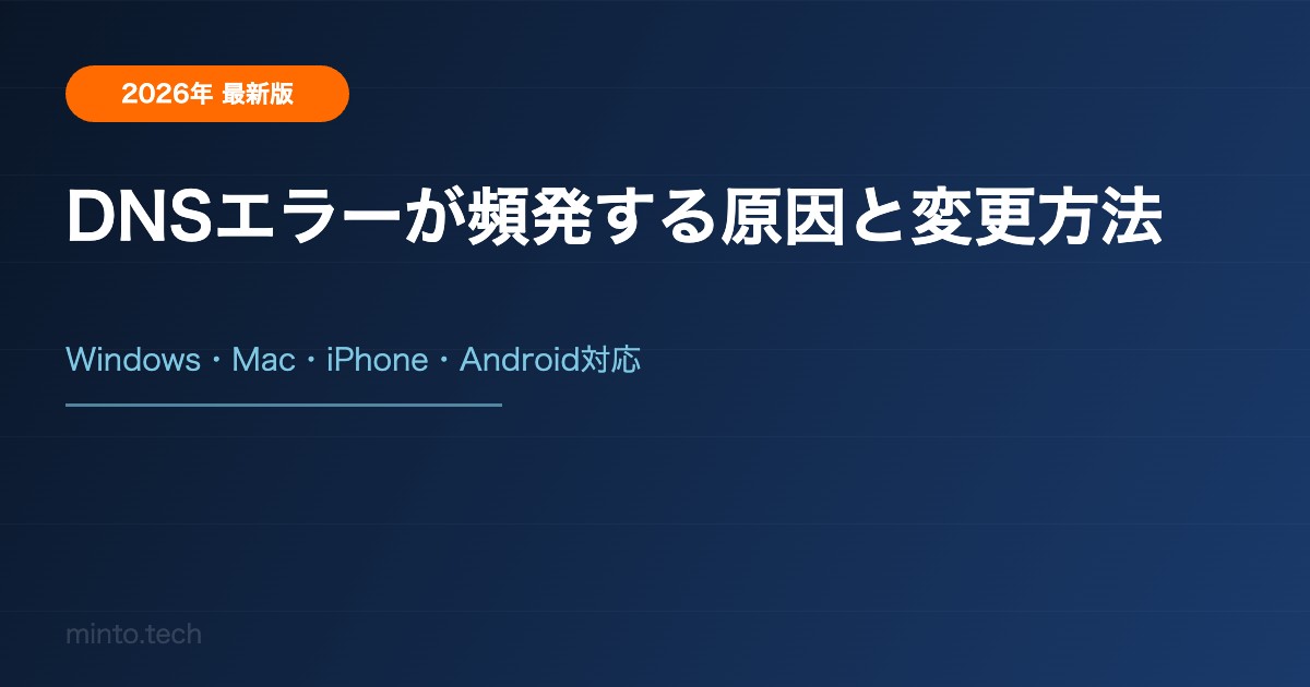 「このサイトにアクセスできません」「DNS_PROBE_FINISHED_NXDOMAIN」——インターネットに繋がっているはずなのに突然ウェブサイトが開けなくなる場合、DNSエラーが原因であることが多いです。この記事ではDNSエラーが頻発する原因と、Windows・Mac・iPhone・AndroidそれぞれのDNS変更手順を解説します。