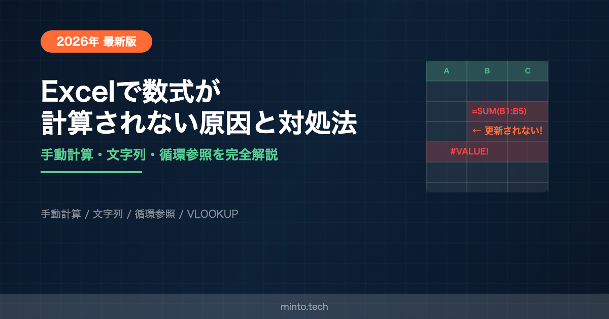 - 「手動計算モード」「文字列書式」「循環参照」など各原因の見分け方