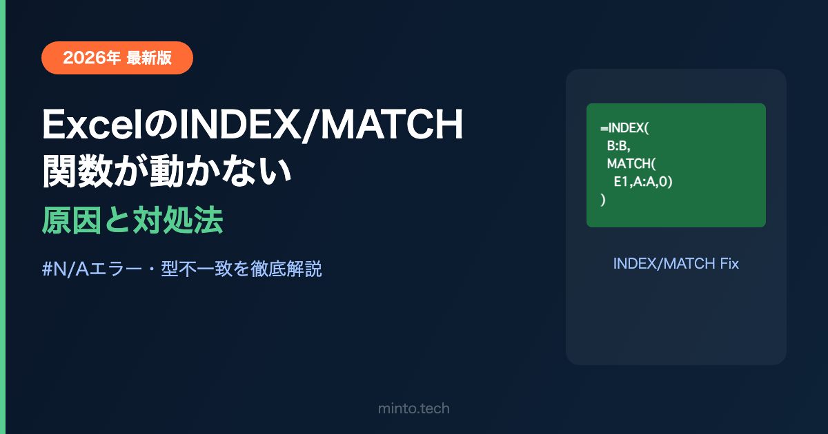 INDEX/MATCHが動かない場合、まずMATCHの第3引数が0(完全一致)になっているか確認し、次に検索値と検索範囲のデータ型が一致しているか確認してください。