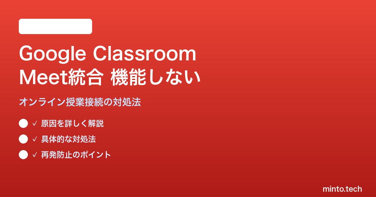 学校管理者はGoogle管理コンソールでMeet統合を有効化し、教師はClassroomのMeetリンクを「クラスに表示」に設定すること、生徒は学校支給のGoogle Workspaceアカウントで参加することが基本の解決策です。