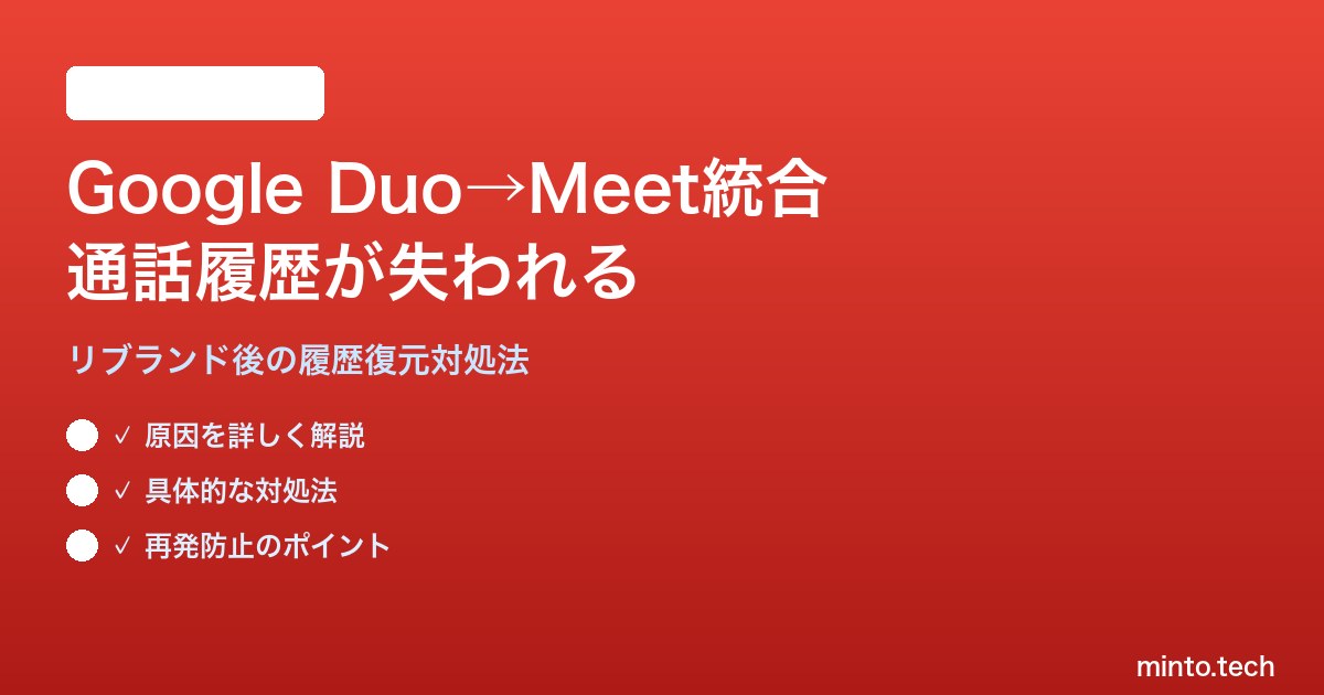 Google DuoからGoogle Meetへの統合(リブランディング)後、長年使ってきた通話履歴が突然消えてしまった——そんな経験をした方は少なくありません。2022年から2023年にかけて行われたDuo→Meet統合プロセスでは、一部のユーザーで通話履歴の移行が不完全となり、大切な連絡の記録が失われるという問題が報告されています。本記事では、なぜ通話履歴が消えるのか、その原因と具体的な対処法を徹底解説します。