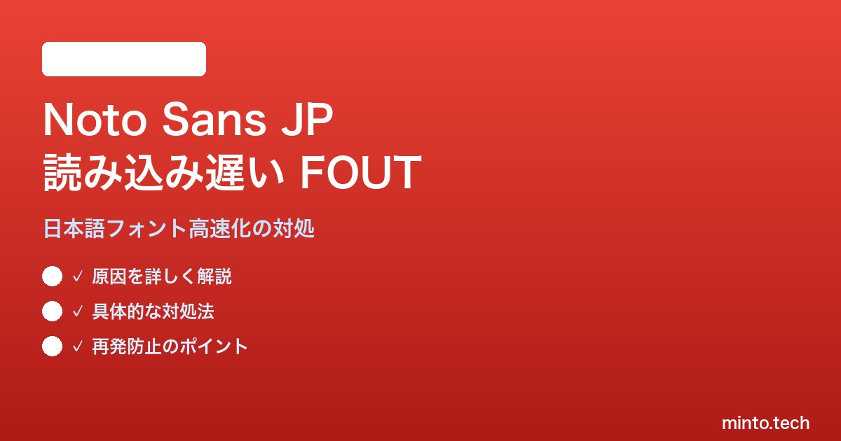 日本語 Web サイトで定番のフォントといえば Google Fonts が提供する「Noto Sans JP」です。デザインが端正で可読性が高く、商用利用もしやすいため、多くのコーポレートサイトやブログで採用されています。しかしこの Noto Sans JP には、ロード時間が長く First Contentful Paint(FCP)を遅らせる、フォント未読込時に標準フォントで一瞬表示されてからガクンと切り替わる「FOUT(Flash of Unstyled Text)」が起きる、という慢性的な悩みが付きまといます。