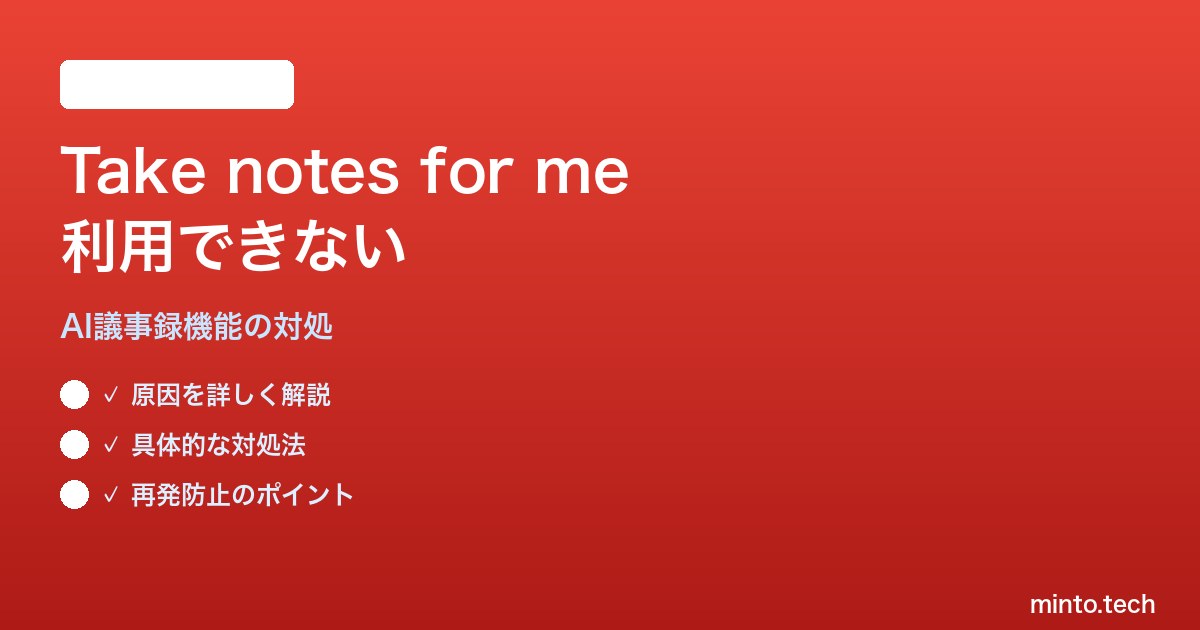Google MeetのAIメモ作成「Take notes for me」が利用できない場合、原因のほとんどはライセンス、組織管理者の設定、対応言語、主催者権限のいずれかです。個人利用の場合は対応エディションへのアップグレードが必要であり、組織内で使えない場合は管理者にGemini機能の有効化を依頼するのが最短ルートです。