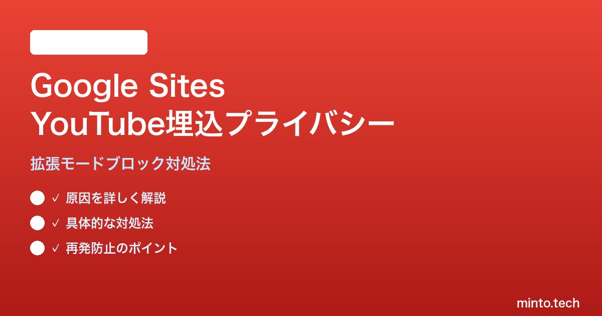 Google Sitesを使って社内ポータルや教育用サイトを構築している方の中で、YouTubeの動画を埋め込もうとした際に「プライバシー拡張モード(youtube-nocookie.com)」がブロックされ、動画が正しく表示されないというトラブルが増えています。特に学校・企業のGoogleワークスペース環境で顕著に発生しており、管理者が設定を変更したつもりでも解決しないケースが多く報告されています。