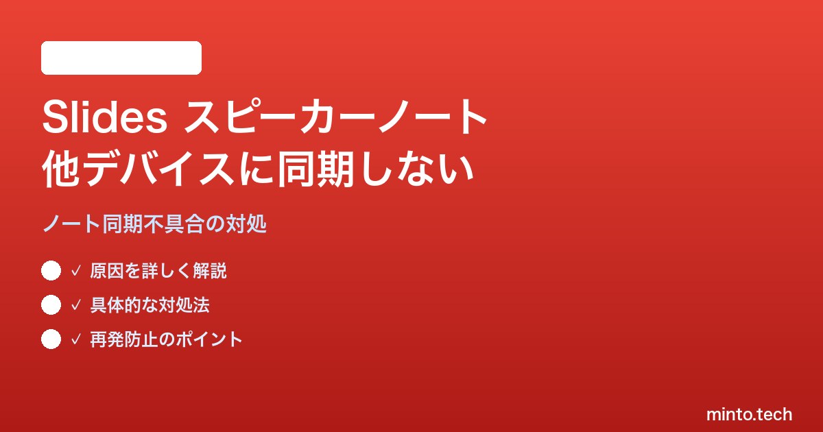 Google Slidesで入念に書き込んだスピーカーノートが、なぜかiPhoneやiPadのSlidesアプリで開いたときに空欄のまま表示されない。PCで編集した発表用メモが、プレゼン直前にタブレットに反映されていない。こうした「スピーカーノートの同期不具合」は、Google Slidesを日常的に使っているユーザーの間で定期的に報告される問題です。原因はオフライン状態のキャッシュ、モバイル版アプリ側の仕様制限、共有アカウントの扱い、さらにはプレゼンテーションモードでの表示設定まで、意外と多岐にわたります。