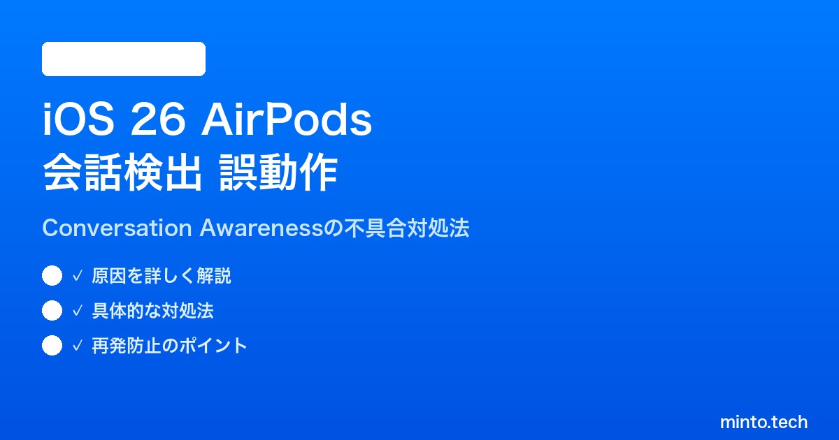 iOS 26のAirPodsで会話検出が誤動作する問題は、マイク感度アルゴリズムの変更・ファームウェアの不一致・ペアリング情報の破損・空間オーディオとの干渉などが主な原因です。