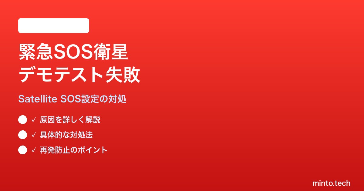 衛星経由の緊急SOSデモが失敗するときは、まず「対応機種か」「対応国か」「空が見える場所か」「Apple ID と緊急連絡先が設定されているか」の 4 点を順番に確認してください。これだけで大半のケースは解消します。日本での本サービス提供は段階拡大中ですので、最新の iOS にアップデートし、屋外でデモが成功する状態を作っておけば、いざという時に必ず役立ちます。練習しておくこと自体が最大の備えです。