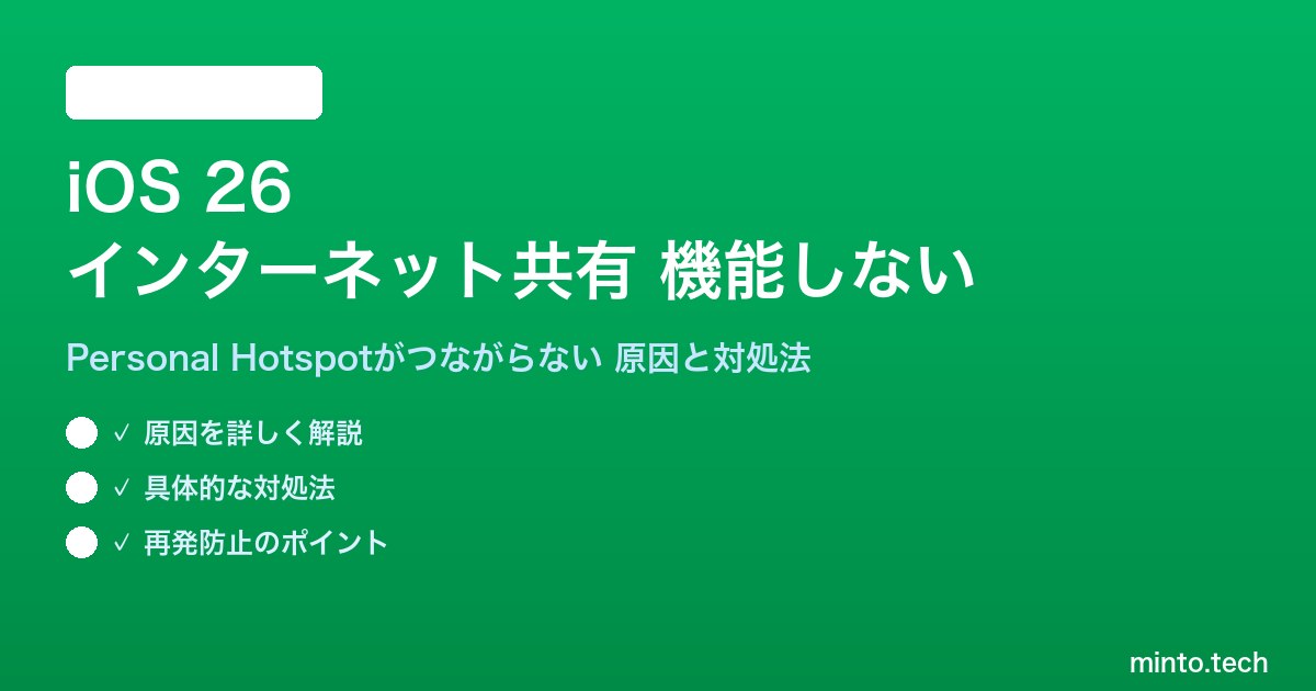 インターネット共有(Personal Hotspot)が使えない原因はさまざまです。iOS 26特有の問題から、キャリアのプラン設定、デバイス側の設定ミスまで幅広く考えられます。