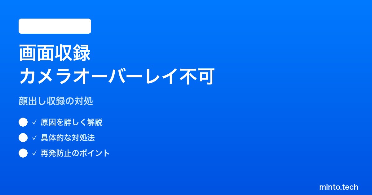 ただし、サードパーティアプリ(Picture-in-Picture対応のカメラアプリ)を組み合わせることで、擬似的にカメラオーバーレイ録画を実現できます。さらに、外部機器を使ったハードウェア合成では完全な顔出し録画が可能です。