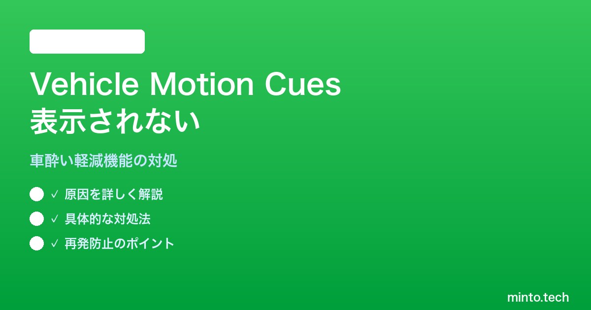 iOS 18で追加された「Vehicle Motion Cues(車両モーションキュー)」は、車内でiPhoneを見ているときに発生する動揺病(いわゆる車酔い)を軽減するための新しいアクセシビリティ機能です。画面の四隅に小さな黒いドットが表示され、車の加速・減速・旋回に合わせてアニメーションすることで、目から入る視覚情報と内耳が感じる揺れの情報のズレを脳が調停しやすくする仕組みになっています。ところが実際に使おうとしても「ドットが出てこない」「自動検出モードにしても反応しない」「手動でONにしても表示されない」といった声が非常に多く聞かれます。本記事ではVehicle Motion Cuesが表示されない原因を切り分け、確実に有効化して車酔いを緩和するための具体的な手順を徹底解説します。