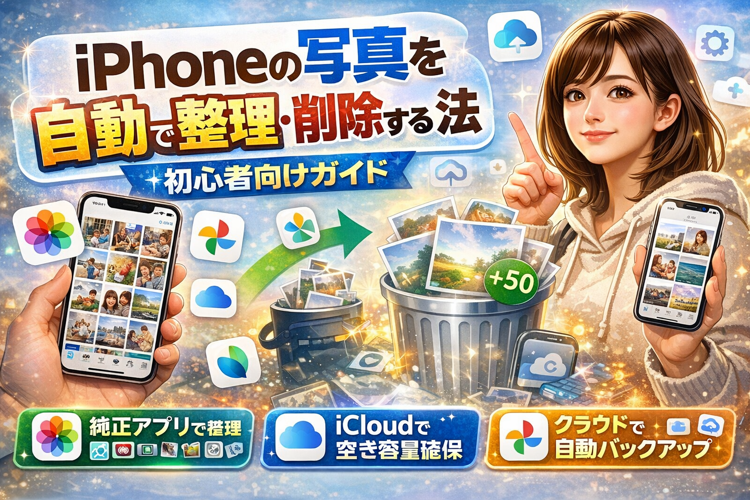 しかし安心してください。iPhoneには写真を簡単に整理するための便利な機能がたくさんあり、標準機能とサードパーティアプリを正しく活用すれば、写真の整理と削除はほぼ自動化できます。本記事では、IT初心者の方でも今日から実践できる写真管理術を、基本設定からAI活用、ショートカット自動化まで段階的に解説します。専門用語はできるだけわかりやすく補足しながら、家族みんなで試せる優しい説明を心がけています。