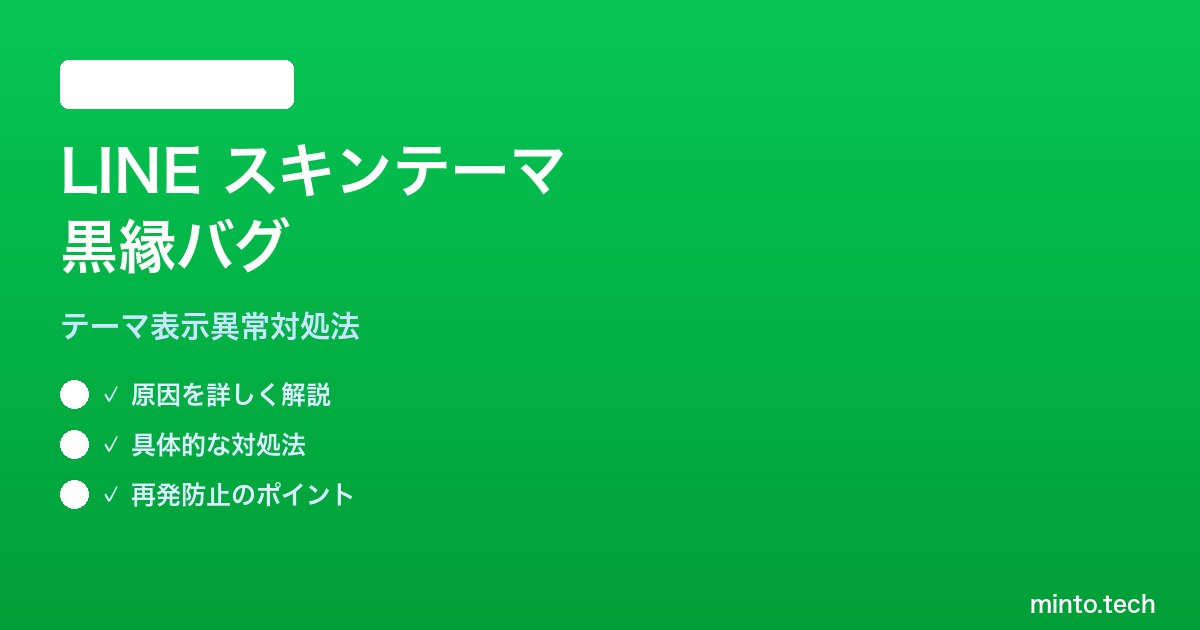LINEスキンテーマ適用後の黒縁バグは、テーマ素材のアルファチャンネル処理の問題・LINEアップデートとの互換性問題・キャッシュの破損などが主な原因です。まずはキャッシュのクリアとデフォルトテーマへの切り替えを試し、それで解消しなければテーマの再ダウンロードやLINEアプリのアップデートを行いましょう。