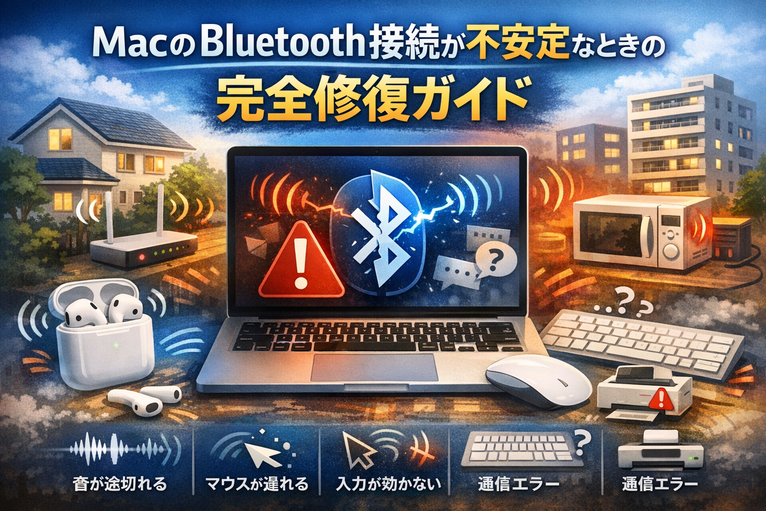 「とりあえず再起動」で解決しなかった方も、この記事を読めばきっと解決の糸口が見つかるはずです。家庭での利用シーンを前提に、木造戸建てから鉄筋コンクリートマンション、ワンルームまで様々な住環境での注意点や工夫も取り上げます。大切なデバイス(AirPods、Magic Mouse、Magic Keyboard、スピーカー等)を安定して使えるよう、順を追って完全修復を目指しましょう。