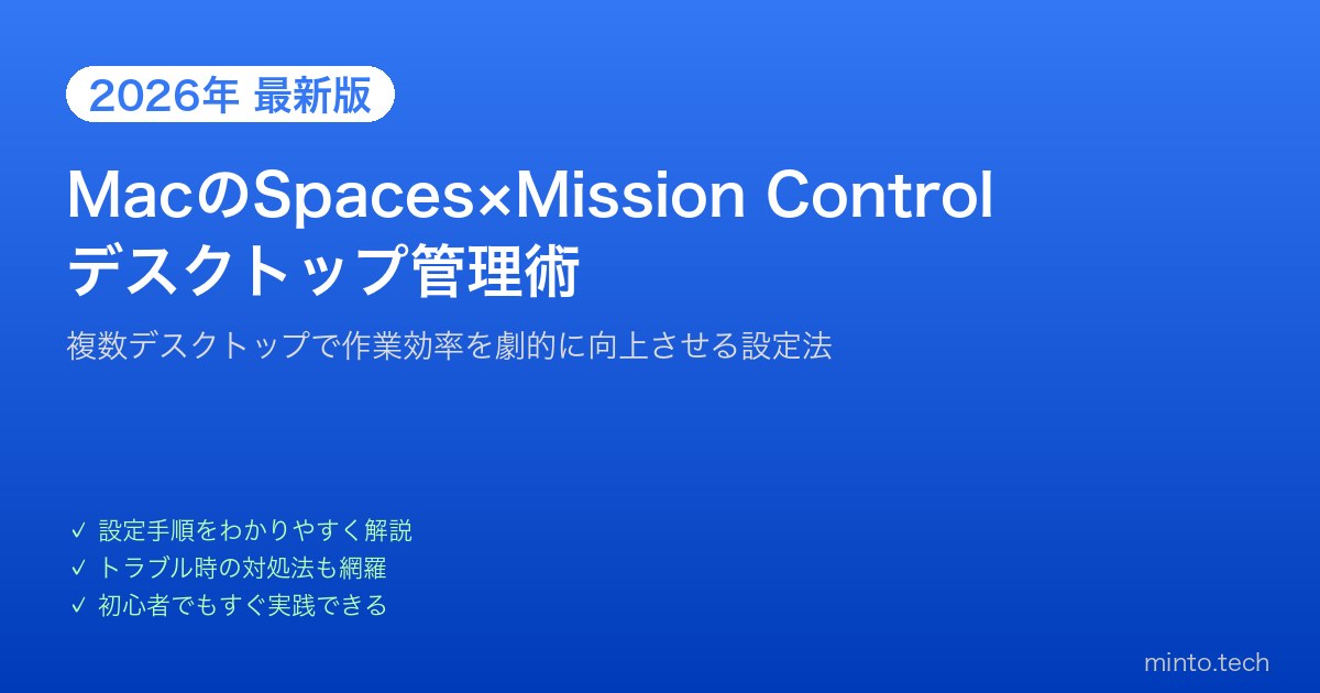 Macで作業中に「ウィンドウが多すぎて画面が散らかる…」と感じたことはありませんか?macOSの「デスクトップスペース」と「Mission Control」を活用すれば、作業内容ごとに画面を分けて整理し、キーボードやトラックパッドで瞬時に切り替えられます。この記事では、デスクトップスペースの作成・管理・カスタマイズ方法を初心者向けに丁寧に解説します。