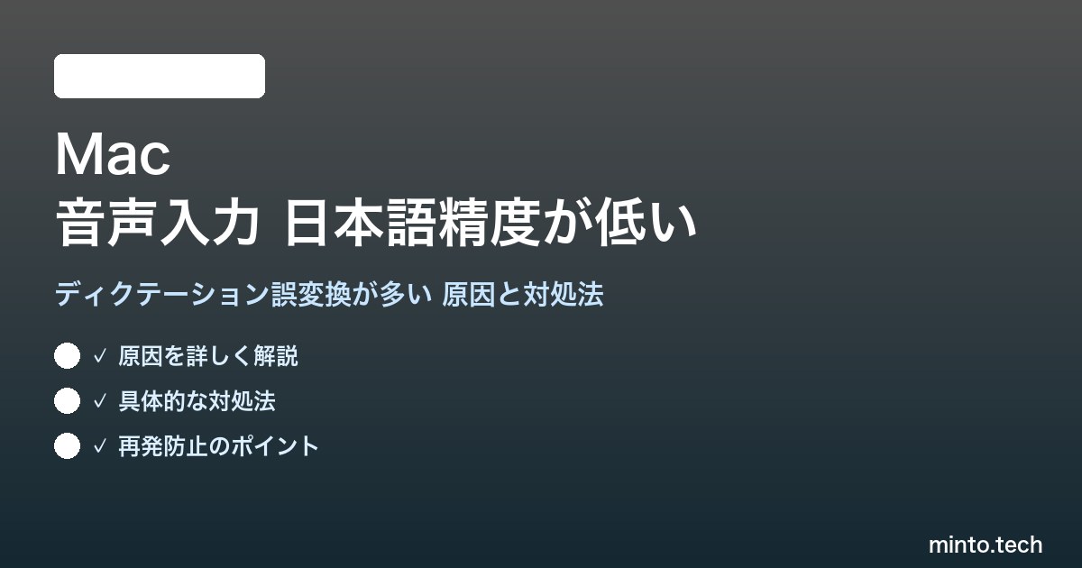 Home / Apple / Mac / 【2026年最新版】Mac(macOS)の音声入力(ディクテーション)で日本語の認識精度が低い・誤変換が多い原因と対処法【完全ガイド】