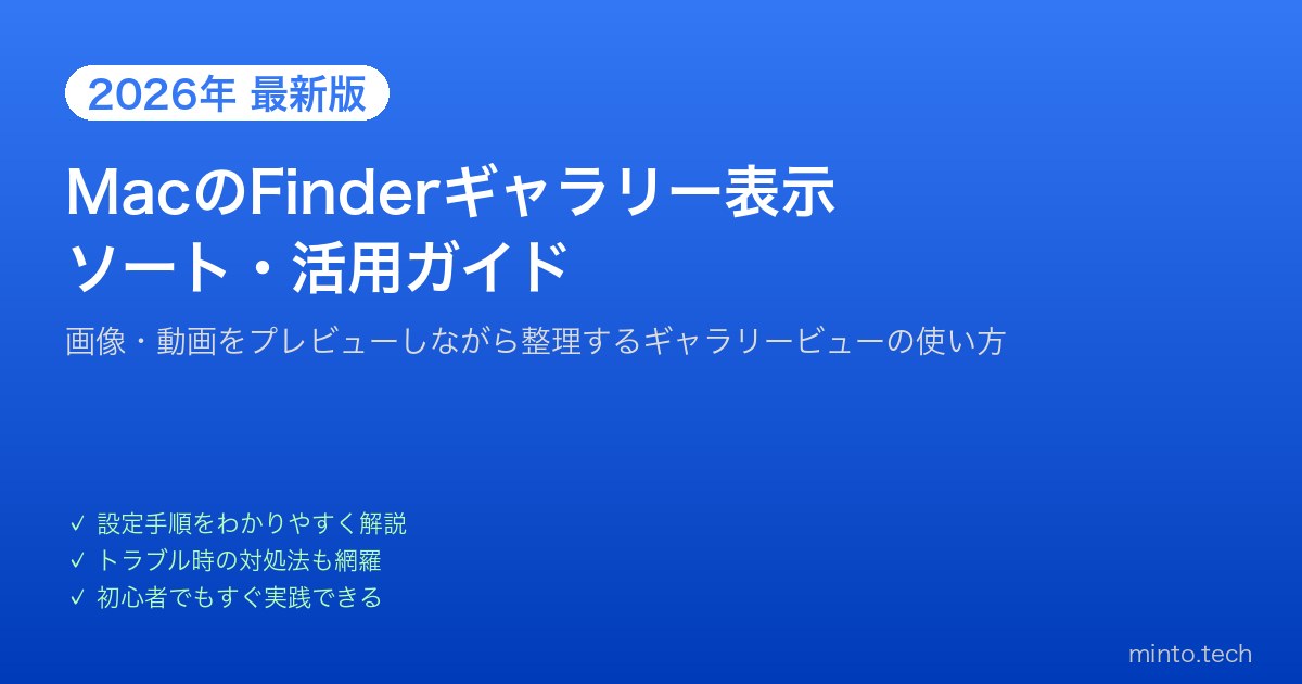 Macのファイル管理ツール「Finder」には、写真や書類を大きなサムネイルで一覧できる「ギャラリービュー」が搭載されています。写真フォルダの整理や画像ファイルの確認に特に便利なこの表示モードを、使いこなせていない方も多いのではないでしょうか。この記事では、Finderのギャラリービューの使い方から、ファイルの並び替え・プレビュー活用・ショートカットまで、日々のファイル管理が劇的に楽になるテクニックを徹底解説します。