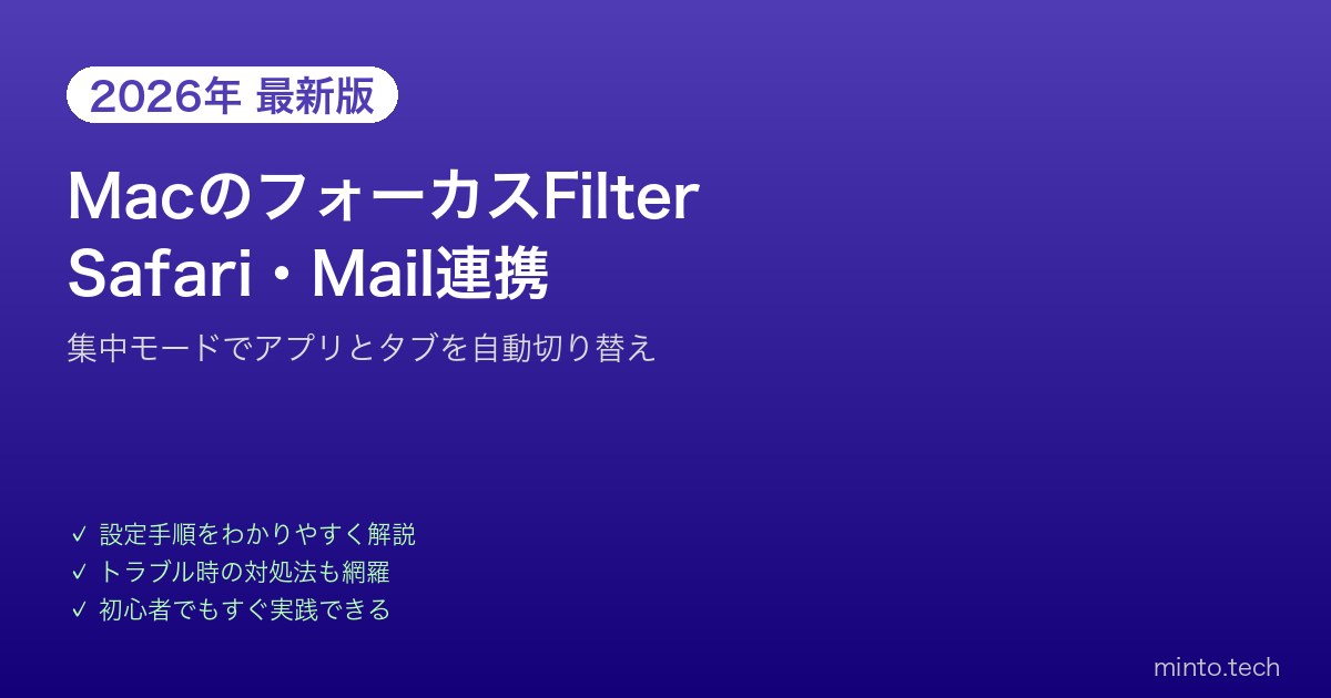 Home / Apple / Mac / 【2026年最新版】MacのフォーカスフィルターでSafariとMailを自動切り替えする方法【完全ガイド】