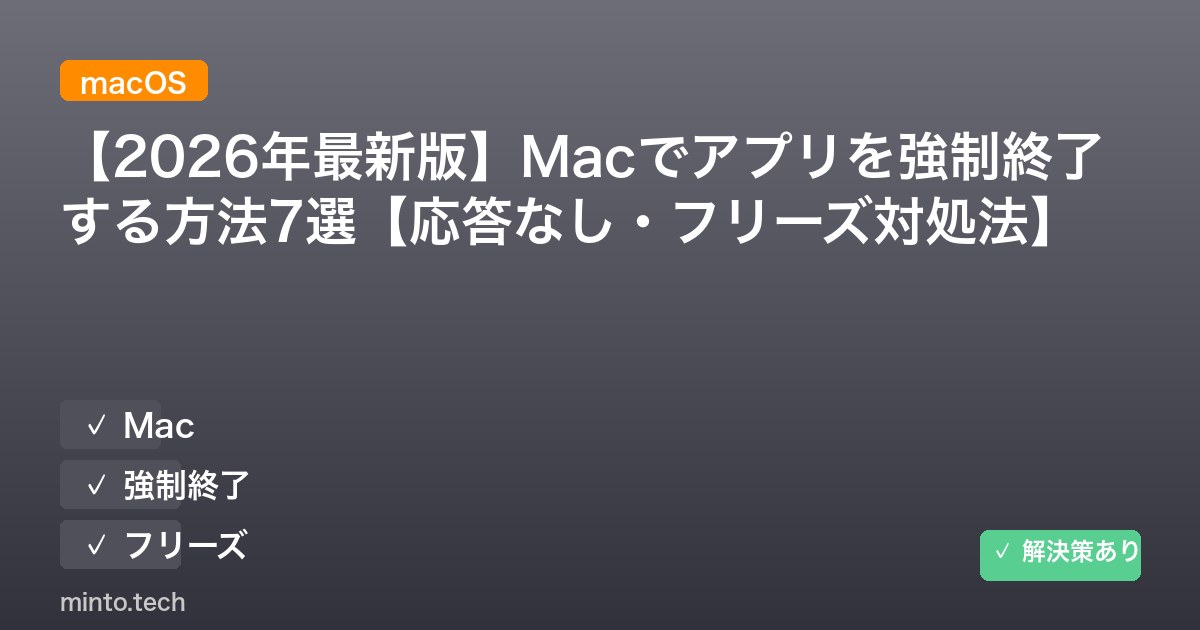 Macでアプリがフリーズ・応答なしになった場合の強制終了方法を7つご紹介しました。改めて整理すると: