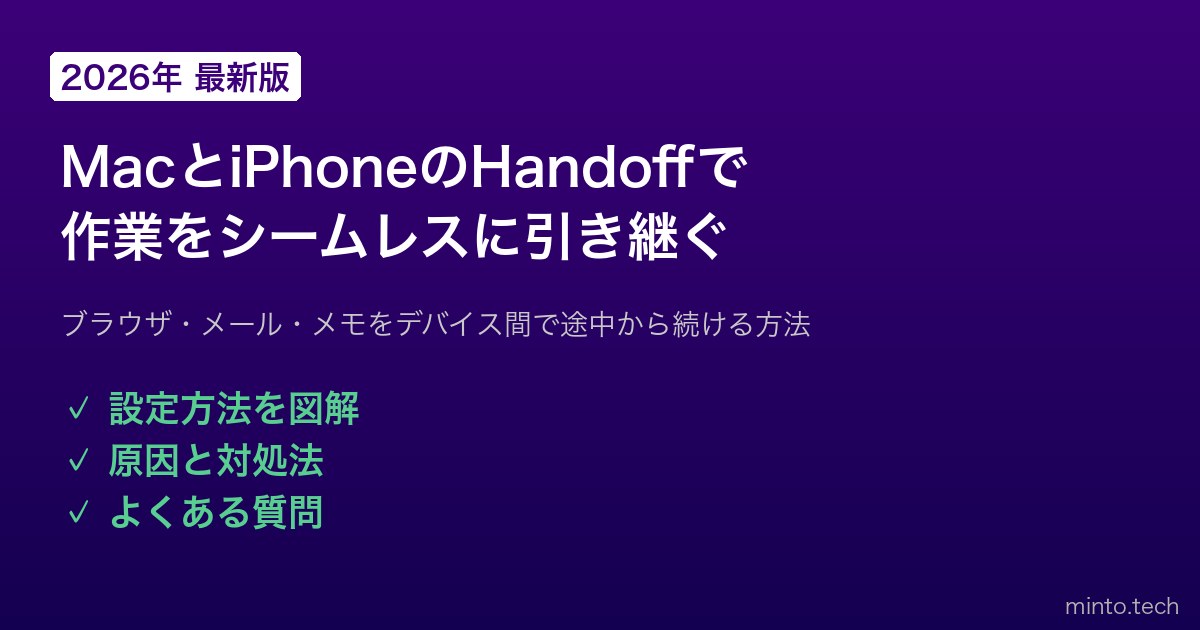 Home / Apple / Mac / 【2026年最新版】MacとiPhoneのHandoff(ハンドオフ)・Continuityで作業を引き継ぐ方法【完全ガイド】