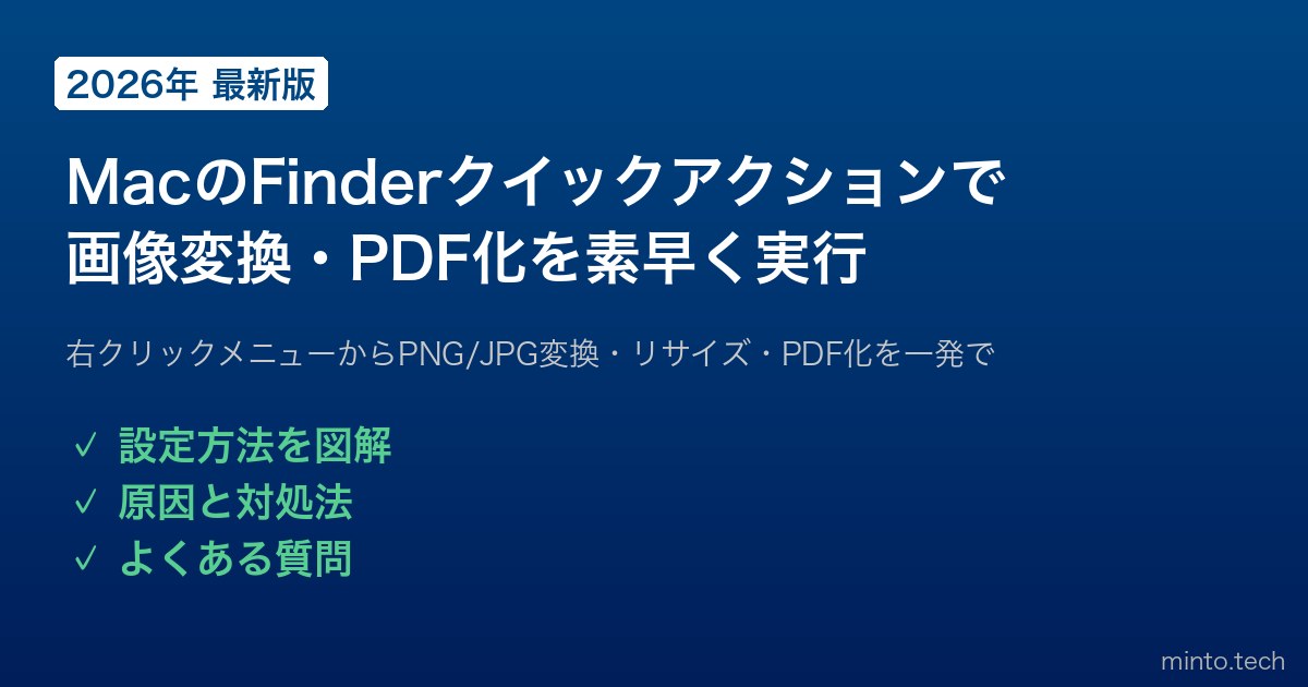 MacのFinderクイックアクションは、別のアプリを開かずにPNG→JPG変換・リサイズ・PDF化・ZIP圧縮などの作業を右クリックだけで完了できる便利な機能です。macOS Mojave以降に標準搭載されているので、すぐに使い始められます。