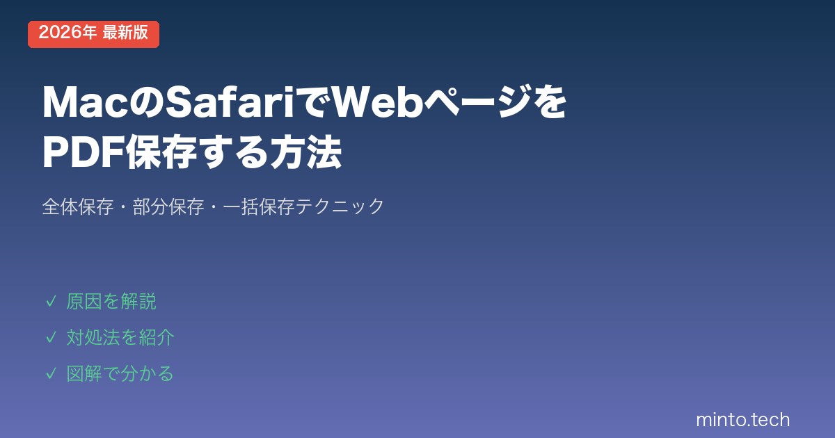MacのSafariには、閲覧中のWebページをPDFファイルとして保存する機能が標準で搭載されています。追加のソフトウェアをインストールしなくても、macOSの標準機能だけでWebページをPDFに変換できます。