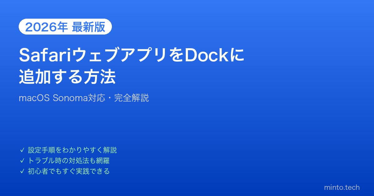 | Safariウェブアプリ(macOS Sonoma) | 任意のウェブサイトをDockに登録してアプリ風に使う機能 | macOS Sonoma以降、Safari使用 |