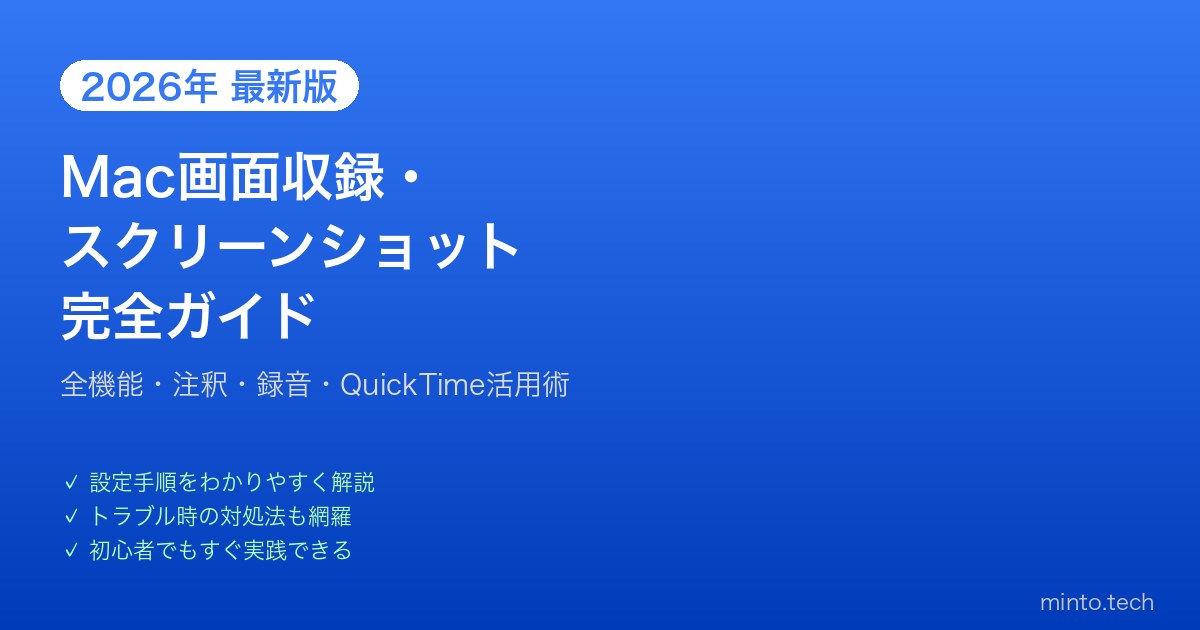 この記事では、Macのスクリーンショット・画面収録の全機能を体系的に解説します。ショートカットキー・保存先の変更・注釈追加・QuickTimeを使った録画まで、初心者でも理解できるよう丁寧に説明します。