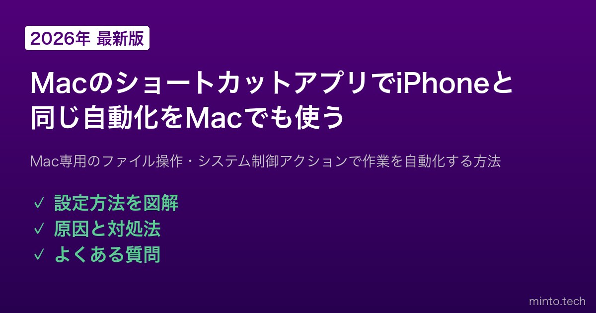 iPhoneやiPadで使えるショートカットアプリ(Shortcuts)が、macOS Monterey(2021年)からMacでも使えるようになりました。これにより、iPhoneで作成した自動化レシピをそのままMacでも実行できるほか、Mac専用のファイル操作・Finder連携・システム制御といった強力なアクションも利用可能になっています。
