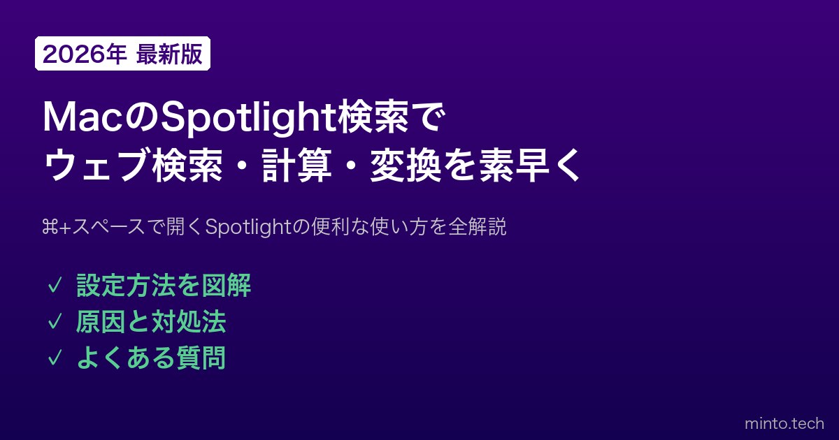 Home / Apple / Mac / 【2026年最新版】MacのSpotlight検索でウェブ検索・計算・変換を素早く行う方法【完全ガイド】