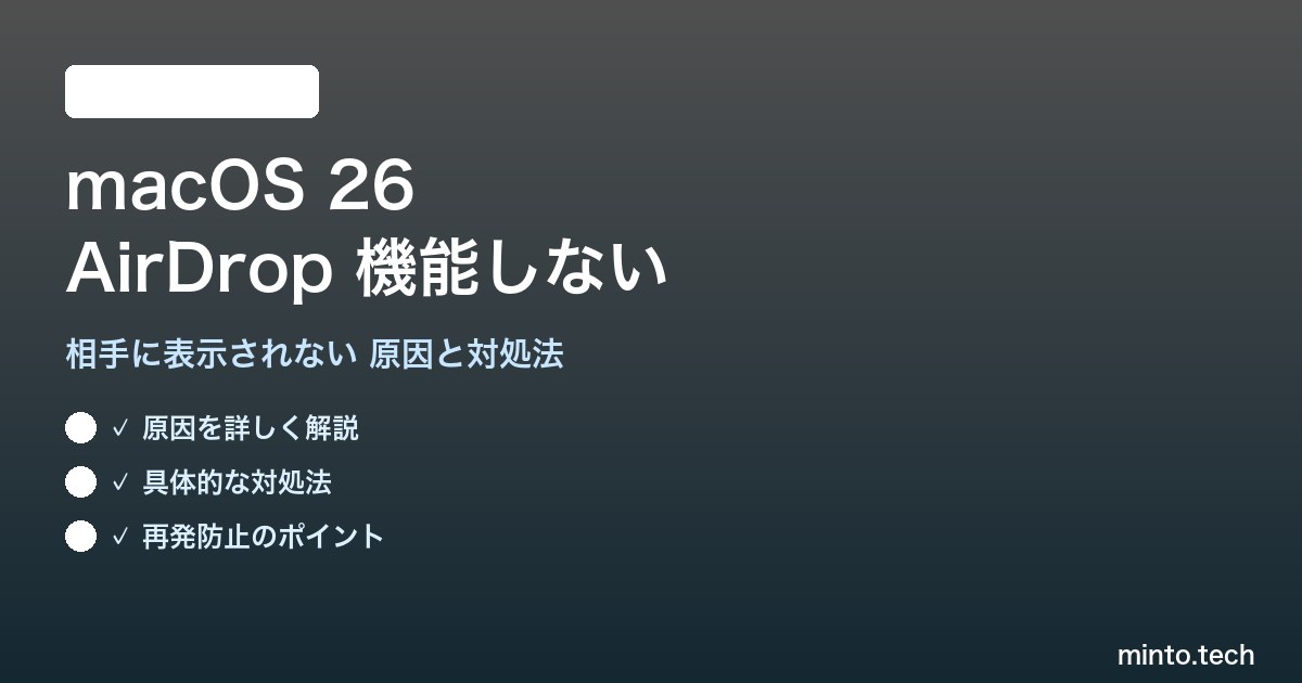 Home / Apple / Mac / 【2026年最新版】macOS 26のAirDropが機能しない・相手に表示されない原因と対処法【完全ガイド】