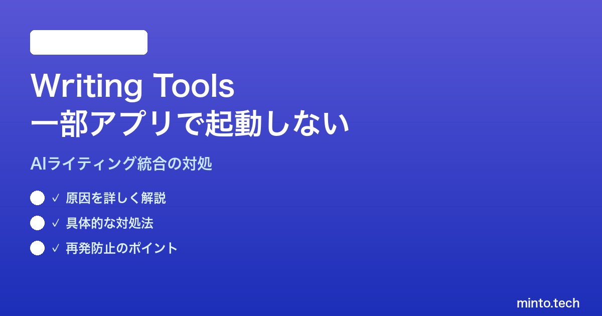 Writing Toolsが特定アプリで起動しない問題は、「アプリ側のテキストフレームワーク対応」「Apple Silicon要件」「地域・言語設定」「ベータ環境の影響」の4軸で原因を切り分けると、ほぼすべてのケースで解決ルートが見えてきます。Mail.appの場合はキャッシュ再構築、サードパーティアプリでは共有メニューやNotes経由の代替活用が有効です。Apple IntelligenceはmacOSのバージョンアップごとに改善が続いているため、症状が改善しない場合でも数か月後には解消されている可能性があります。本記事の手順を順番に試し、それでも解決しなければApple公式サポートに問い合わせて状況を共有しましょう。Writing Toolsを使いこなせれば、ビジネスメールから個人的な文章作成まで幅広いシーンで圧倒的に時短できます。困ったときはいつでもこの記事を見返して、最適な対処法を選んでください。スマートグラスやスマートウォッチが普及するこれからの時代、Macで生成された洗練された文章をシームレスに他デバイスへ展開できるWriting Toolsは、あらゆるユーザーにとって不可欠な道具となるでしょう。日々の運用の中で発見した小さなコツをチームで共有し、組織全体の生産性を底上げしていく姿勢が大切です。