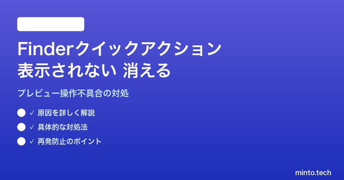 本記事では、MacのFinderクイックアクションが表示されない・カスタムアクションが消える原因と、初心者でも確実に実行できる復旧手順を網羅的に解説します。単純なチェックを入れ直すだけで直るケースから、機能拡張のキャッシュを強制リセットするターミナル操作まで、9つの対処法を段階的に紹介します。
