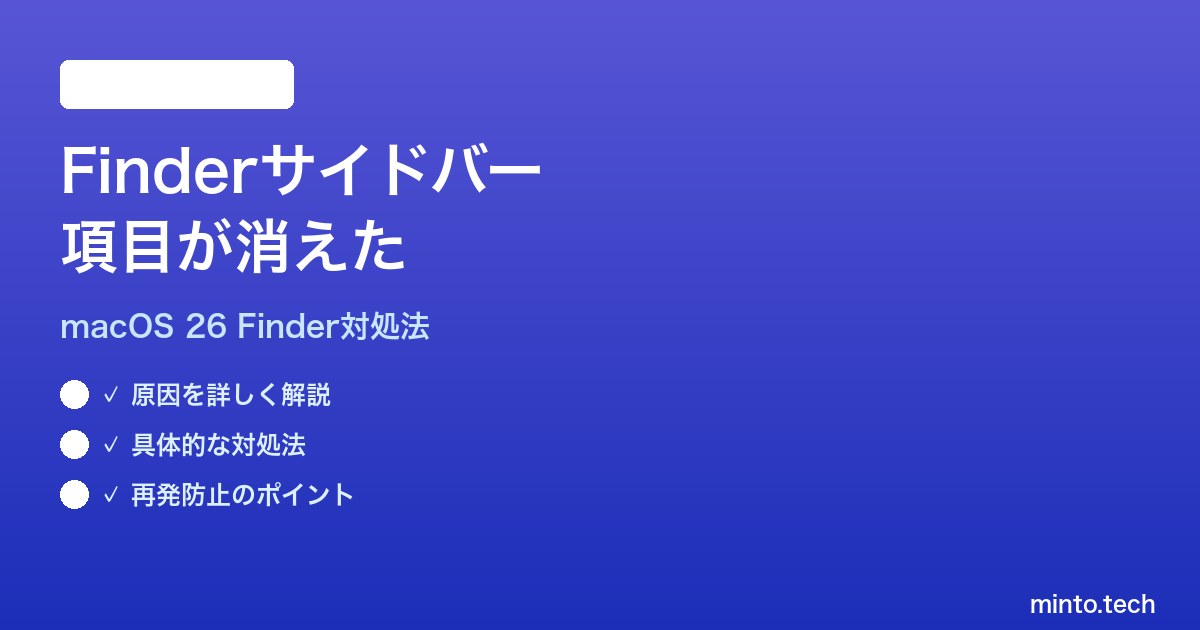macOS 26のFinderサイドバーが消えた問題は、ほとんどの場合、Finder設定から簡単に復元できます。以下のステップを順番に試してください。