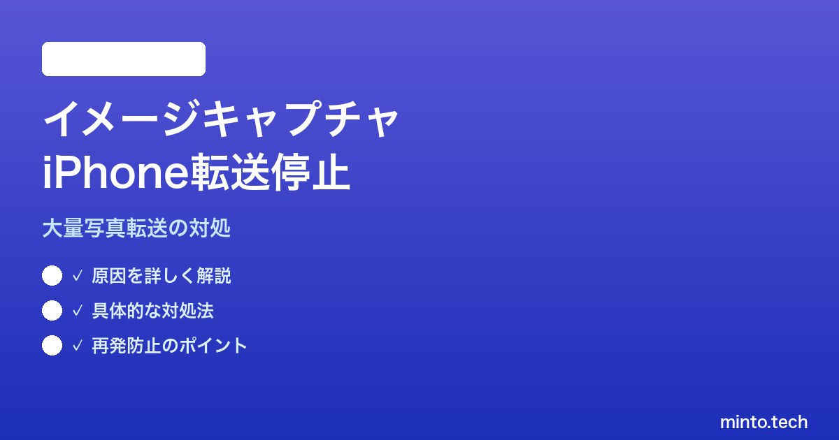 本記事では、イメージキャプチャが途中で止まる現象の根本原因を整理し、再認識操作・HEIC変換オフ・USB規格の見直し・iCloud写真の一時停止・別ツールへの切り替えといった対処法を、初心者でも迷わず実行できる手順で詳しく解説します。3,000枚級の転送を最後まで完走させるための実践的なノウハウを盛り込みました。