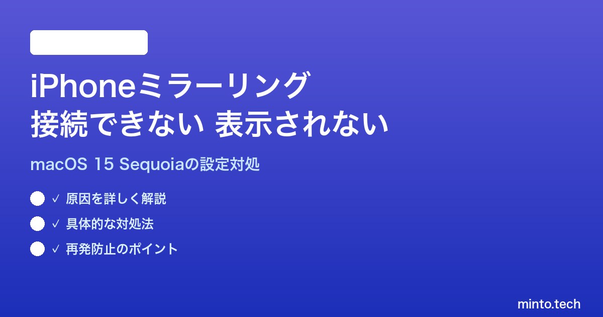 MacのiPhoneミラーリングが接続できない・表示されない場合、原因の大半は設定の不整合です。以下のチェックリストを上から順に確認することで、多くのケースは解決できます。