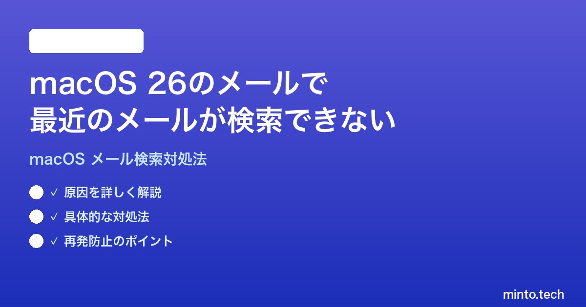 macOS 26でメールアプリの検索が最近のメールを拾わない問題は、主にインデックスの不整合が原因です。以下の手順で解決できます。