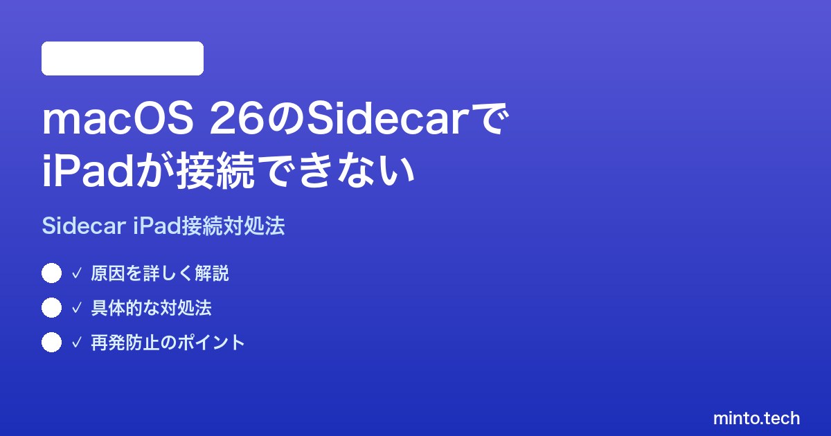 macOS 26でSidecarが接続できない場合、以下の原因が多いです。問題を特定してから対処法を試すと効率的です。