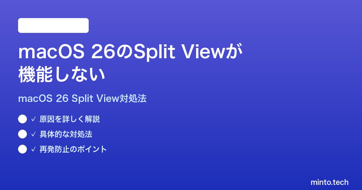 macOS 26のSplit Viewが機能しない主な原因と解決策をまとめると以下のとおりです。
