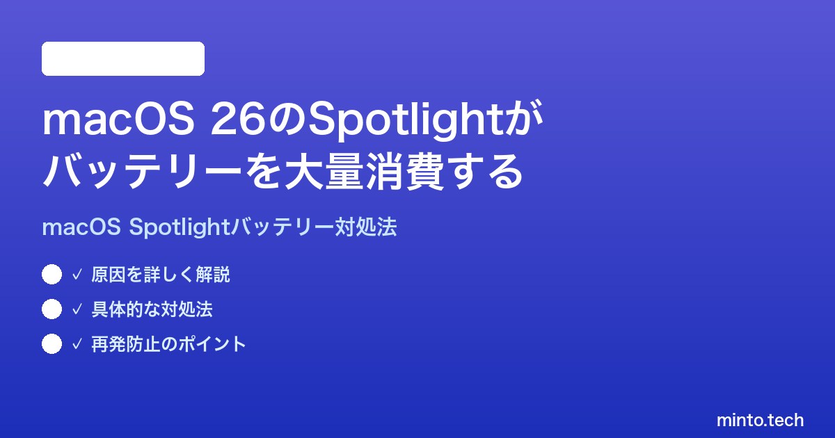 macOS 26のSpotlightインデックス作成によるバッテリー消費問題の対処法をまとめました。