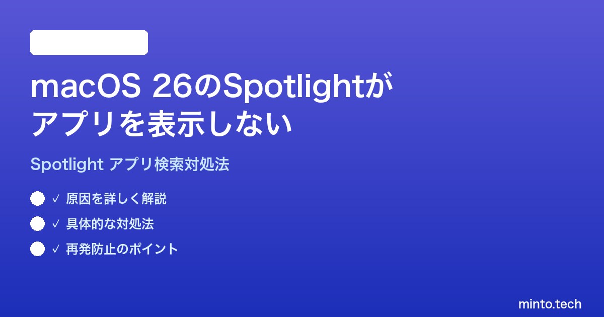 macOS 26でSpotlightにアプリが表示されない場合は、以下の順序で対処するのが最も効率的です。