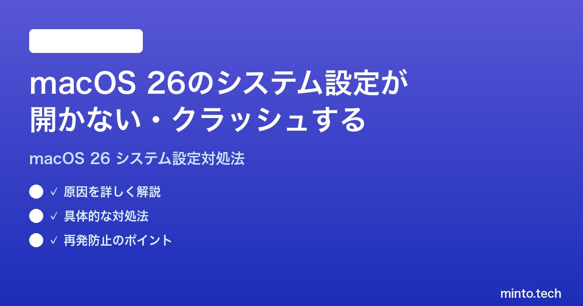 Home / Apple / Mac / 【2026年最新版】macOS 26のシステム設定が開かない・クラッシュする時の対処法【完全ガイド】